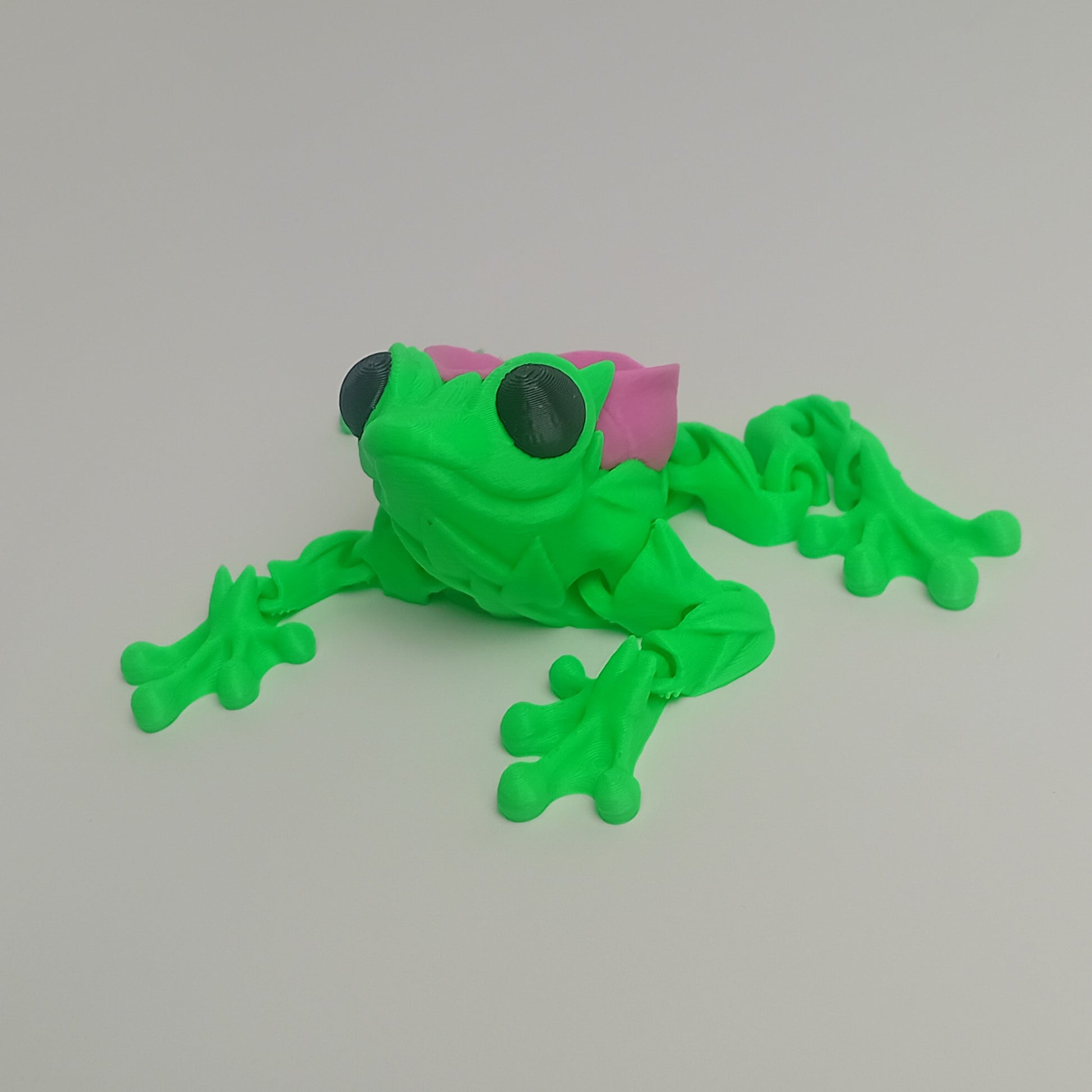 Add this creative and detailed frog with a flower on it's back to your collection! It's limbs have several joints for posing. It is approximately 6 inches in width and length at maximum.