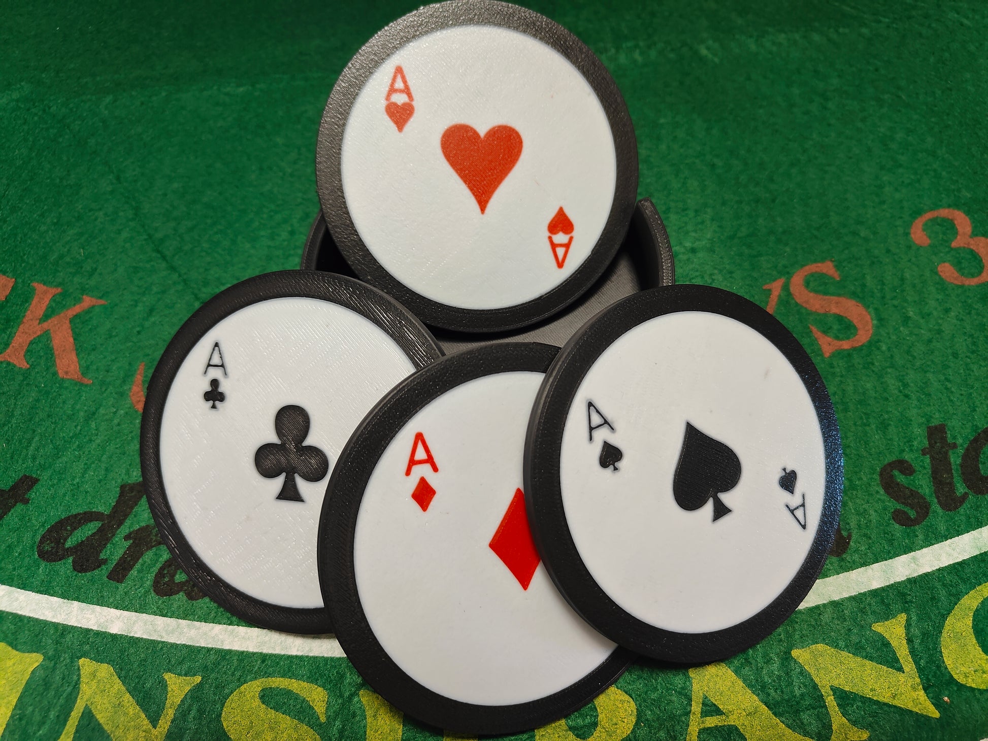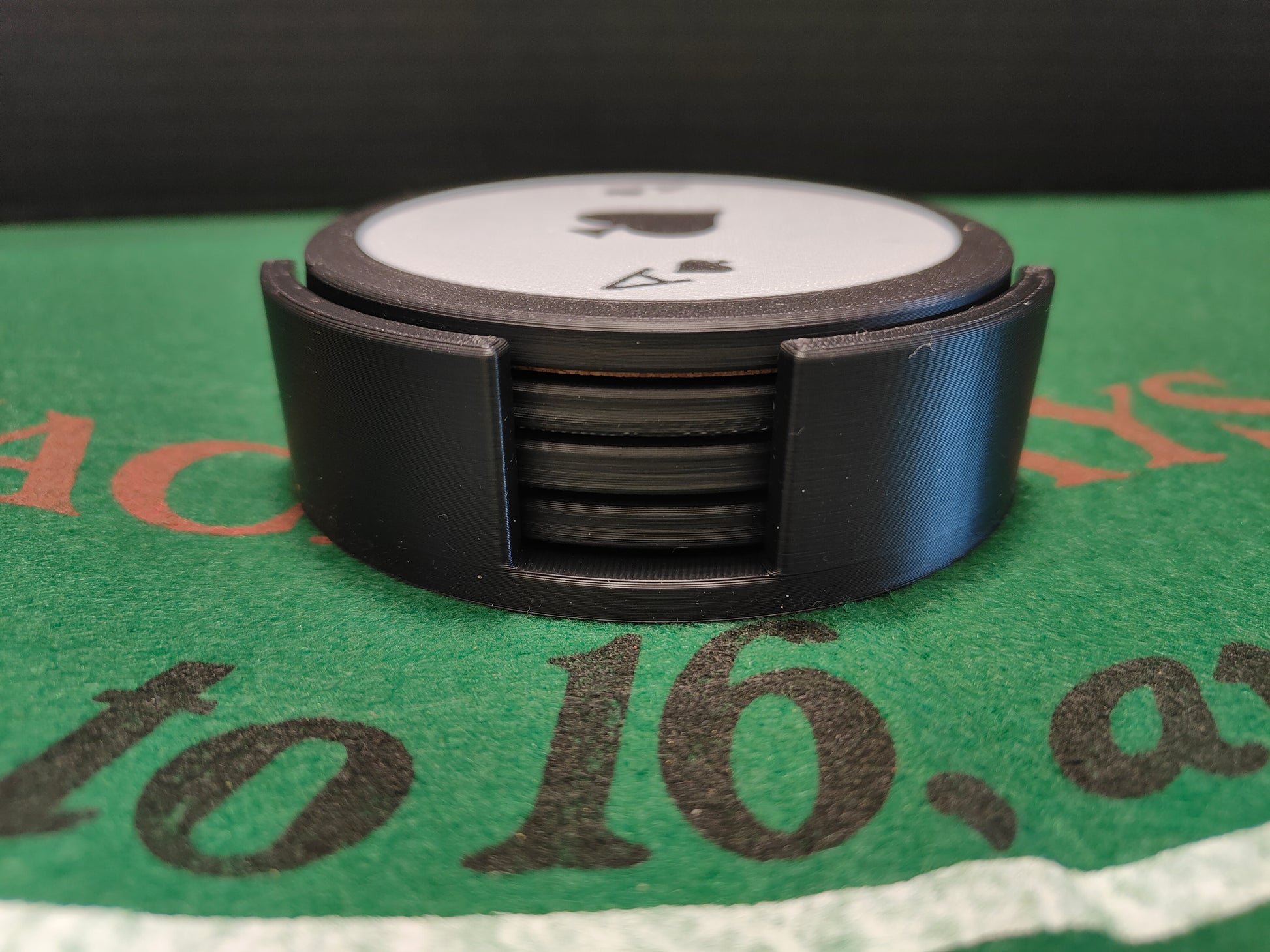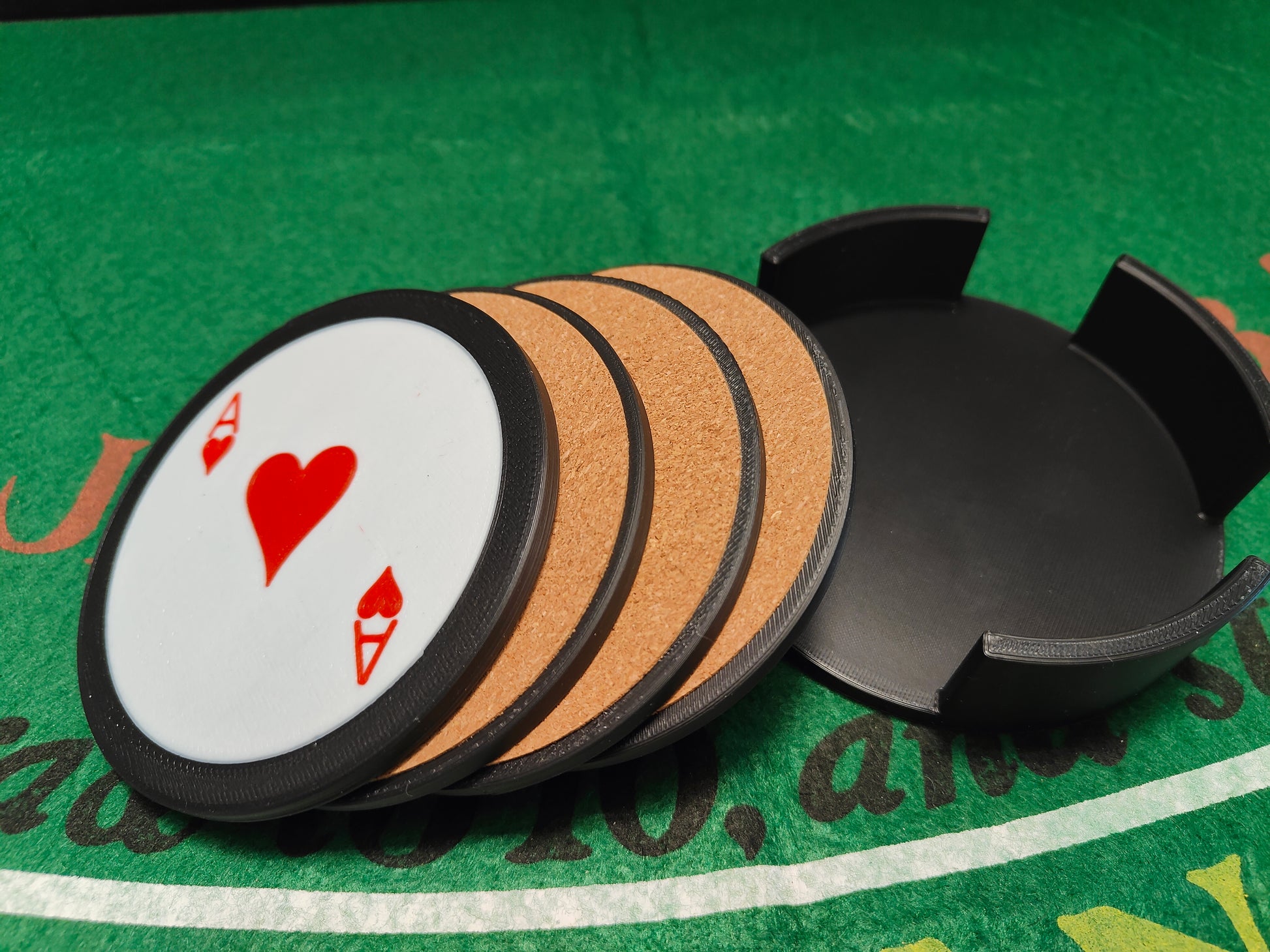 Perfect for the bar, party room or man cave! Set comes with four coasters along with a holder. Each coaster is an Ace of each suit. Each coaster has a cork bottom to prevent slipping on hard surfaces. The coasters are approximately 4 inches in diameter and 1/4 inch thick. These are *not* dishwasher safe and can be cleaned with isopropyl alcohol and/or cold water. These are 3D printed using PLA which is a compostable bio plastic. |