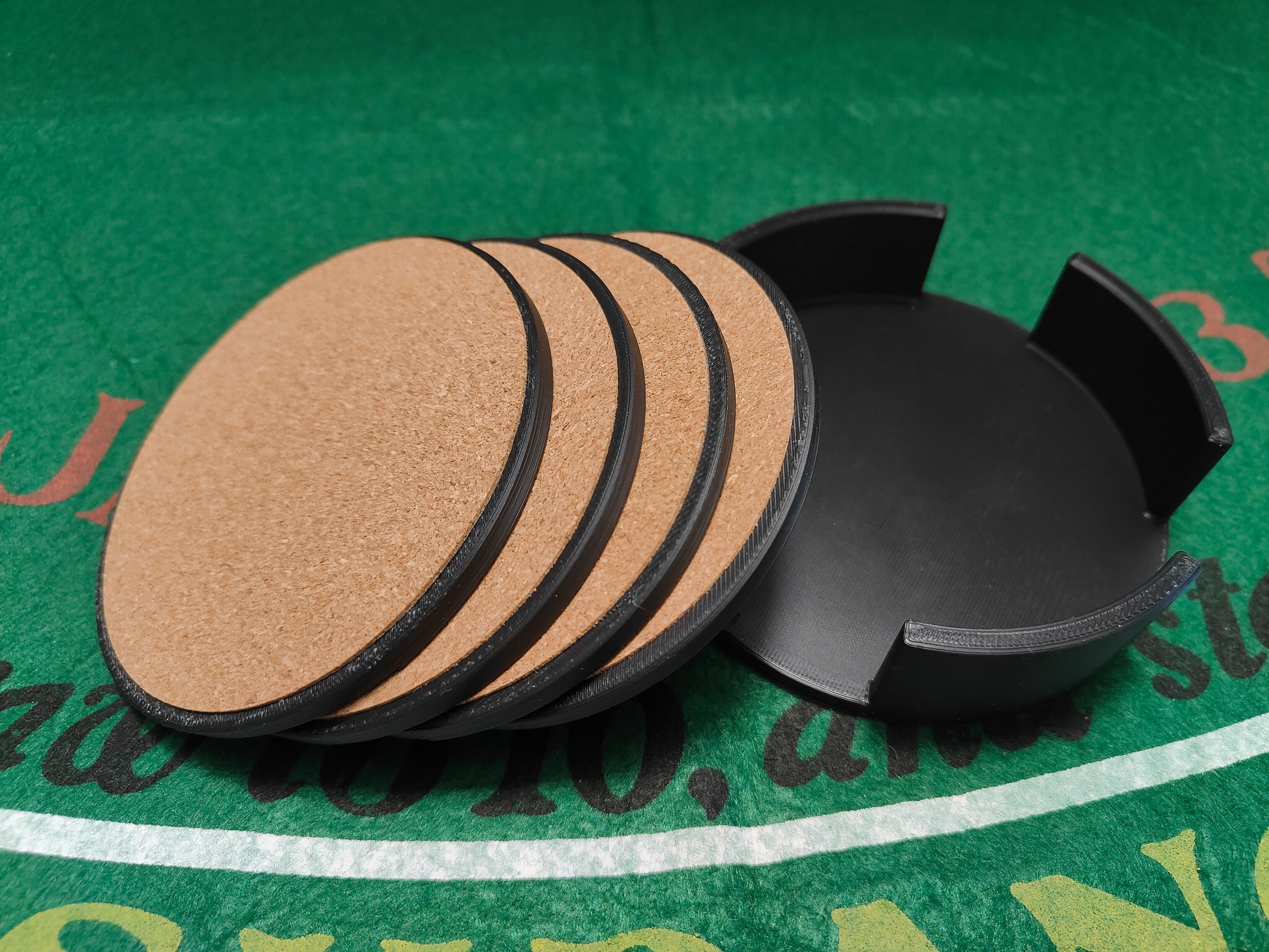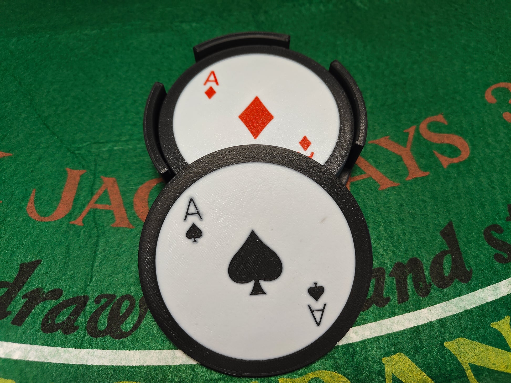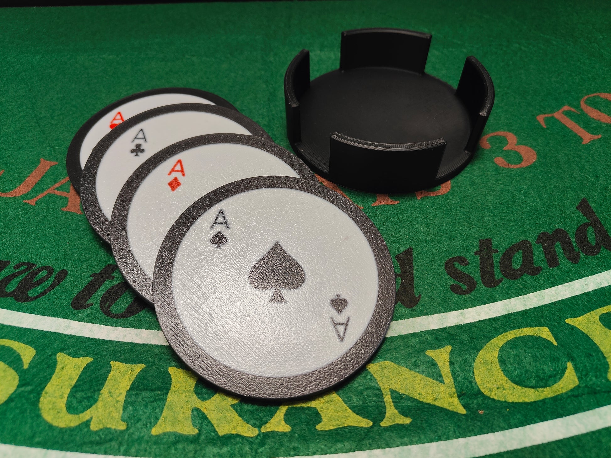 Perfect for the bar, party room or man cave! Set comes with four coasters along with a holder. Each coaster is an Ace of each suit. Each coaster has a cork bottom to prevent slipping on hard surfaces. The coasters are approximately 4 inches in diameter and 1/4 inch thick. These are *not* dishwasher safe and can be cleaned with isopropyl alcohol and/or cold water. These are 3D printed using PLA which is a compostable bio plastic. |