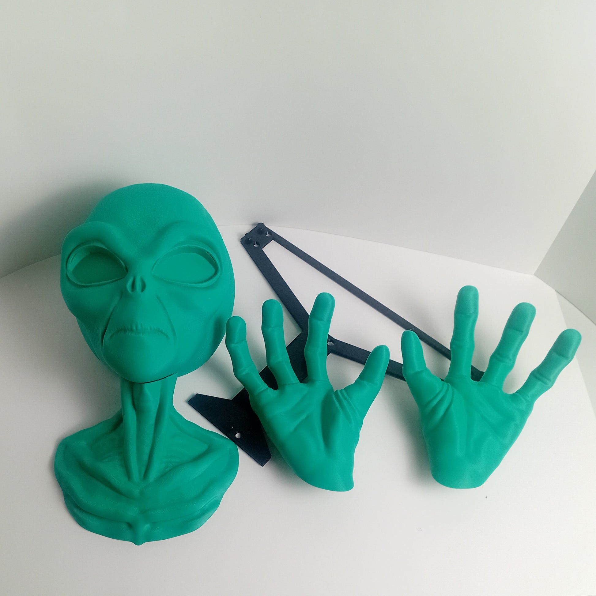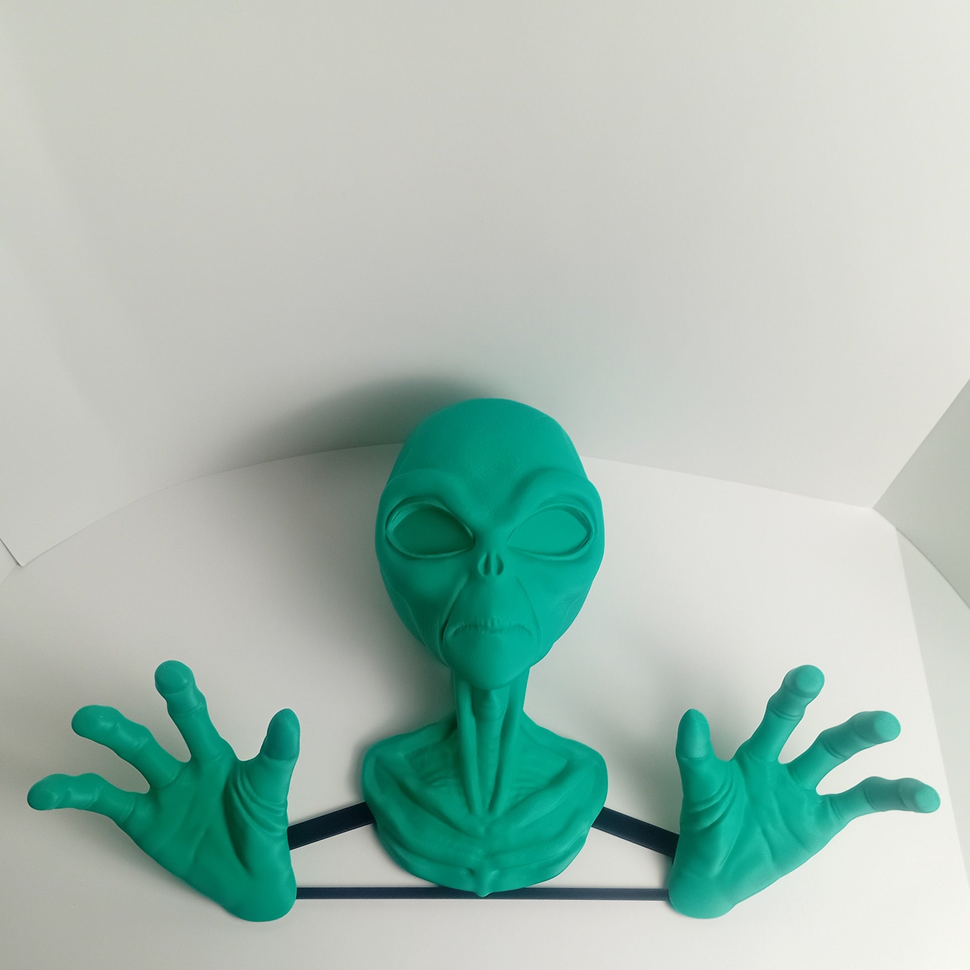 Make a quirky addition to your home decor with this green alien head mount! Includes a head, two hands and a jig for easy installation.