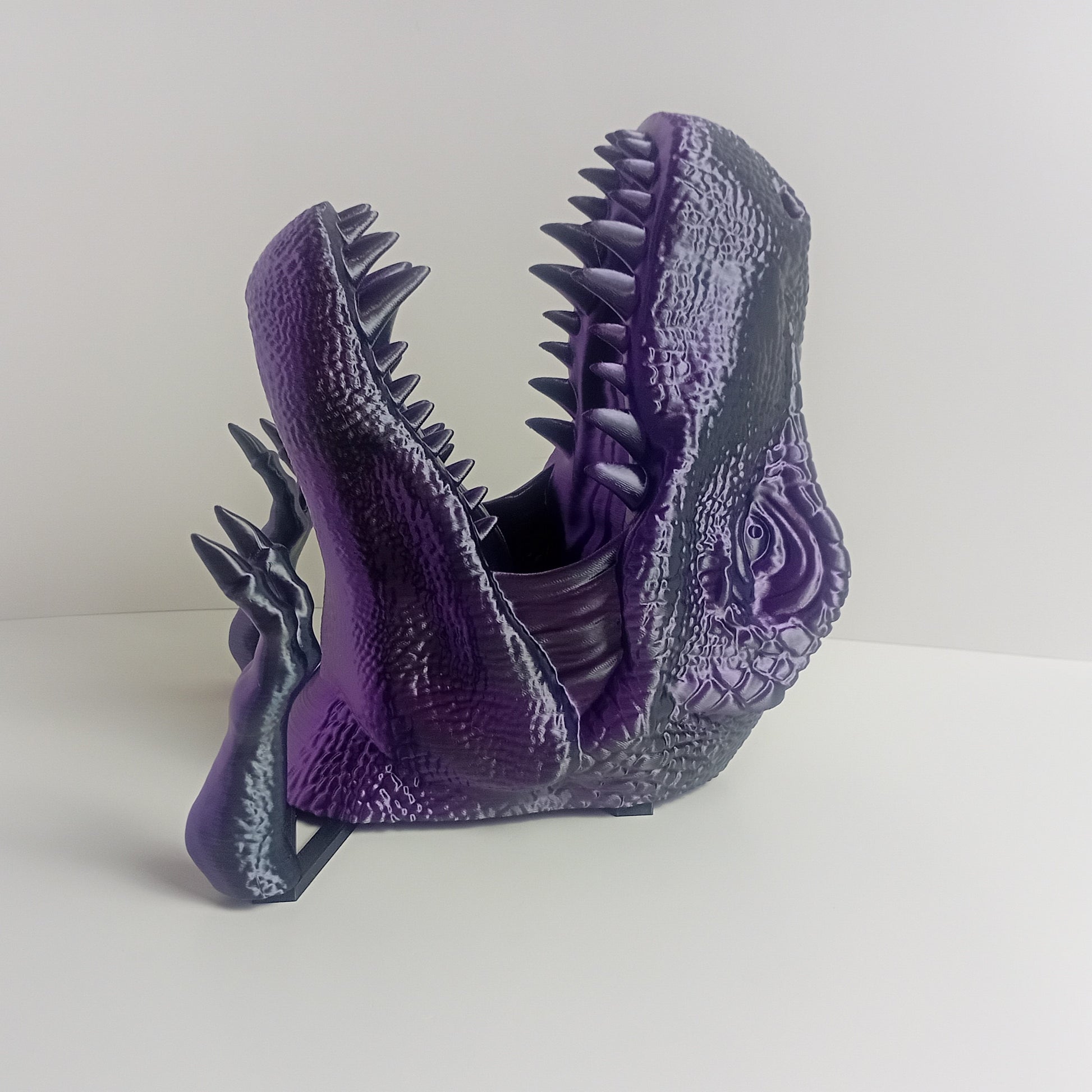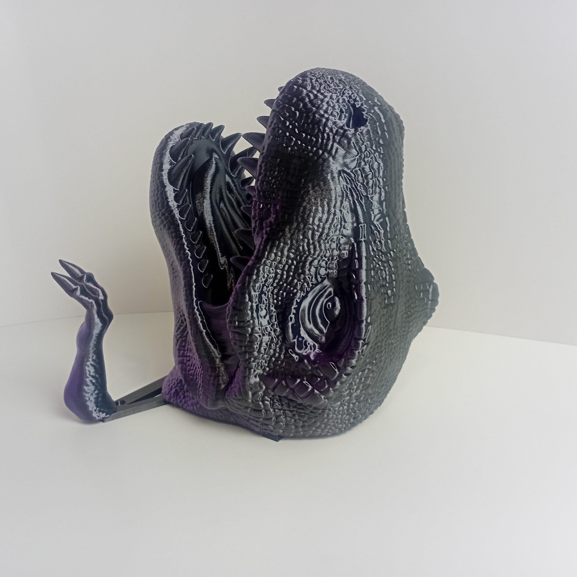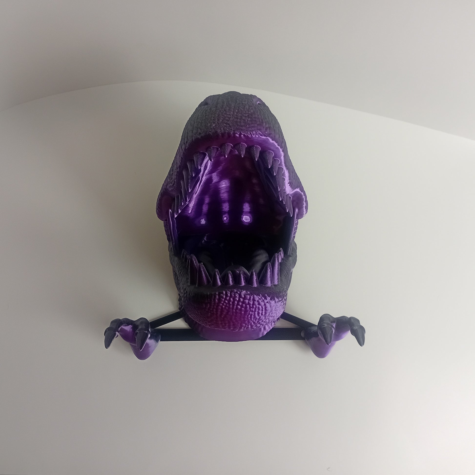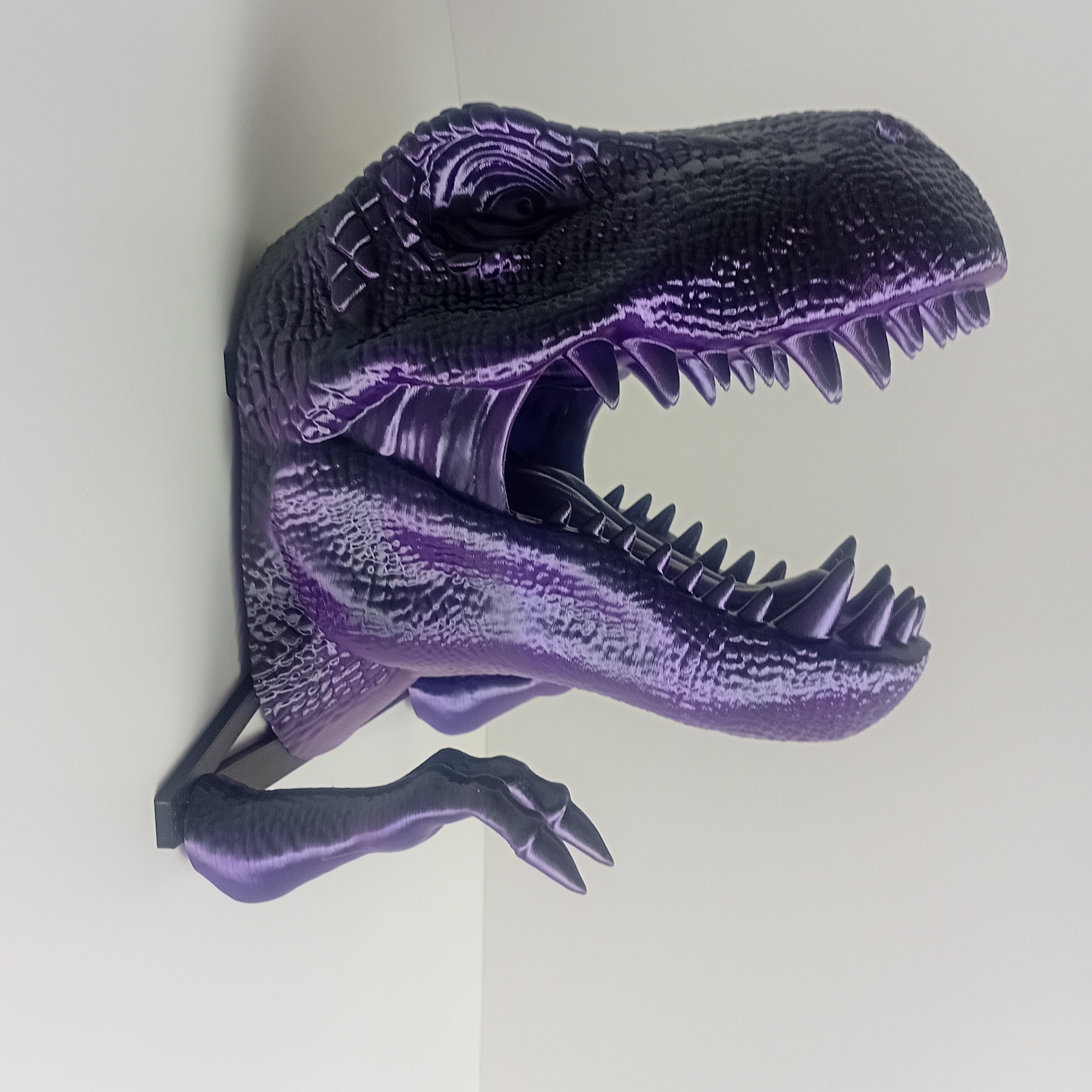 Make a quirky addition to your home decor with this purple and black dino head mount! Includes a head, two hands and a jig for easy installation.